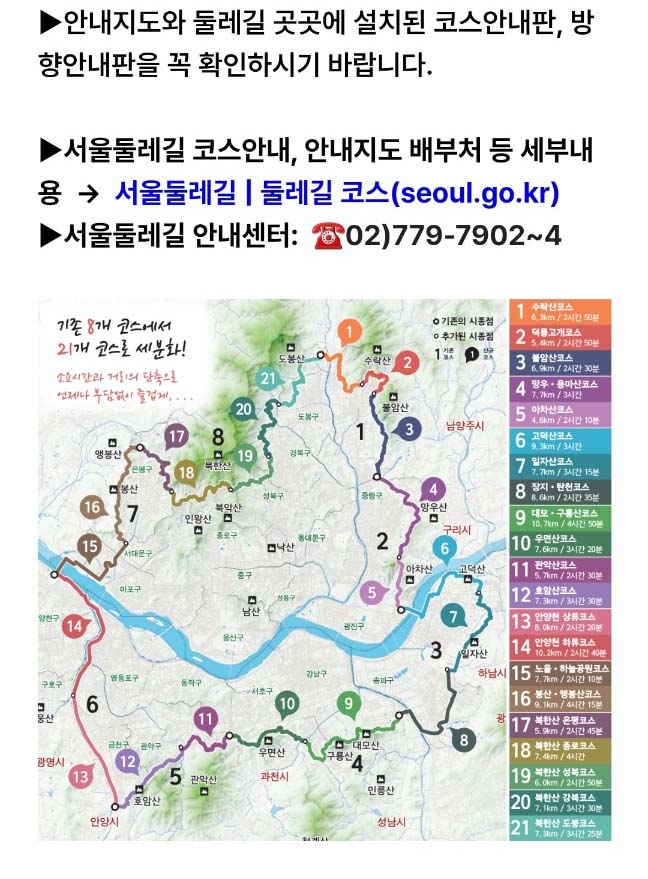 서울을 한 바퀴 휘감는 총 연장 156.5km의 서울 둘레길은 21개코스로 서울의 역사, 문화, 자연생태 등을 스토리로 엮어 국내외 탐방객들이 느끼고, 배우고, 체험할수 있을도록 조성한 도보길입니다