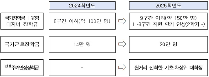 한편 교육부는 2025년 대학생 가구의 학자금 마련 부담을 완화하기 위해 국가장학금 지원 대상을 8구간 이하에서 9구간 이하로 늘리고, 근로장학금 지원 인원을 14만 명에서 20만 명으로 확대했다.