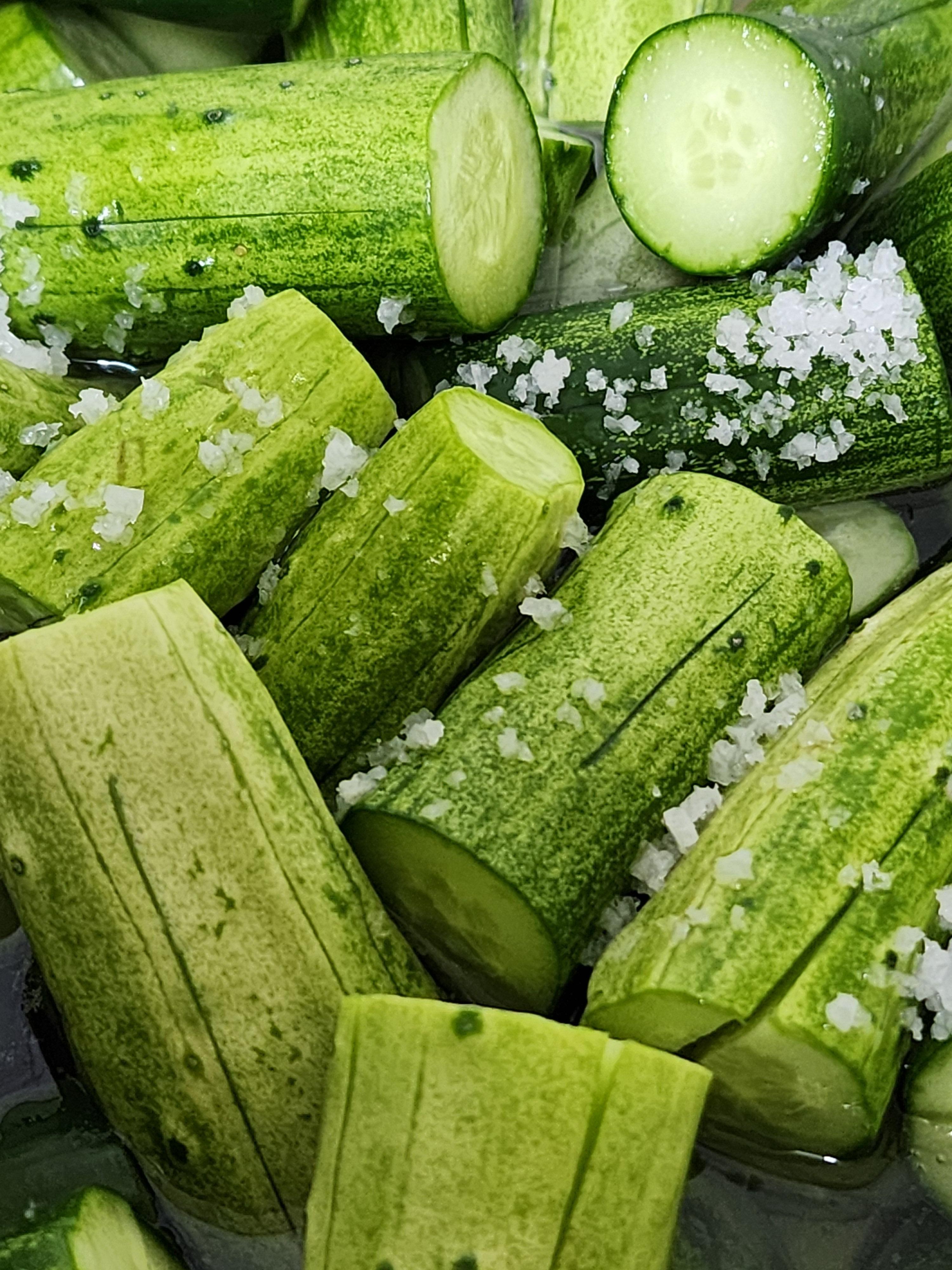 - 절이기: 자른 오이를 큰 볼에 담고 소금 2큰술을 뿌려 잘 섞은 후 20~30분 동안 절입니다. 절인 오이는 찬물에 가볍게 헹궈 소금을 제거한 후 물기를 제거합니다.