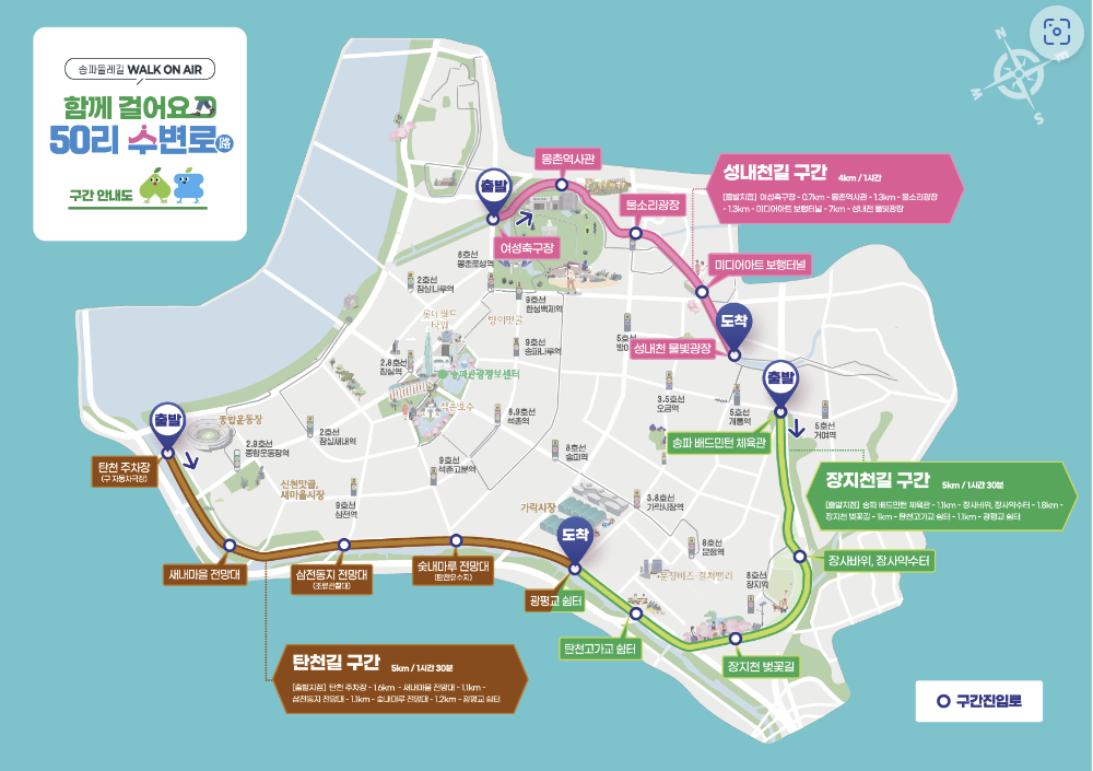 물길과 숲길을 따라 네구간을 완주하려면 5시간 30분 걸리는데, 올림픽공원.장지근린공원.방이습지등 자연명소와 가든파이브. 가락시장등 송파구의 주요상권까지 촘촘히 이어져 있어 사통팔달 송파지역 어디서든 접근 가능합니다