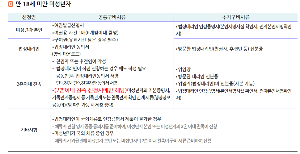미성년자 여권의 교부 : 친권자의 신분증, 접수증, 친권자임을 증명하는 서류(건강보험증 등), 대리인 주민등록증(대리인 수령 시)