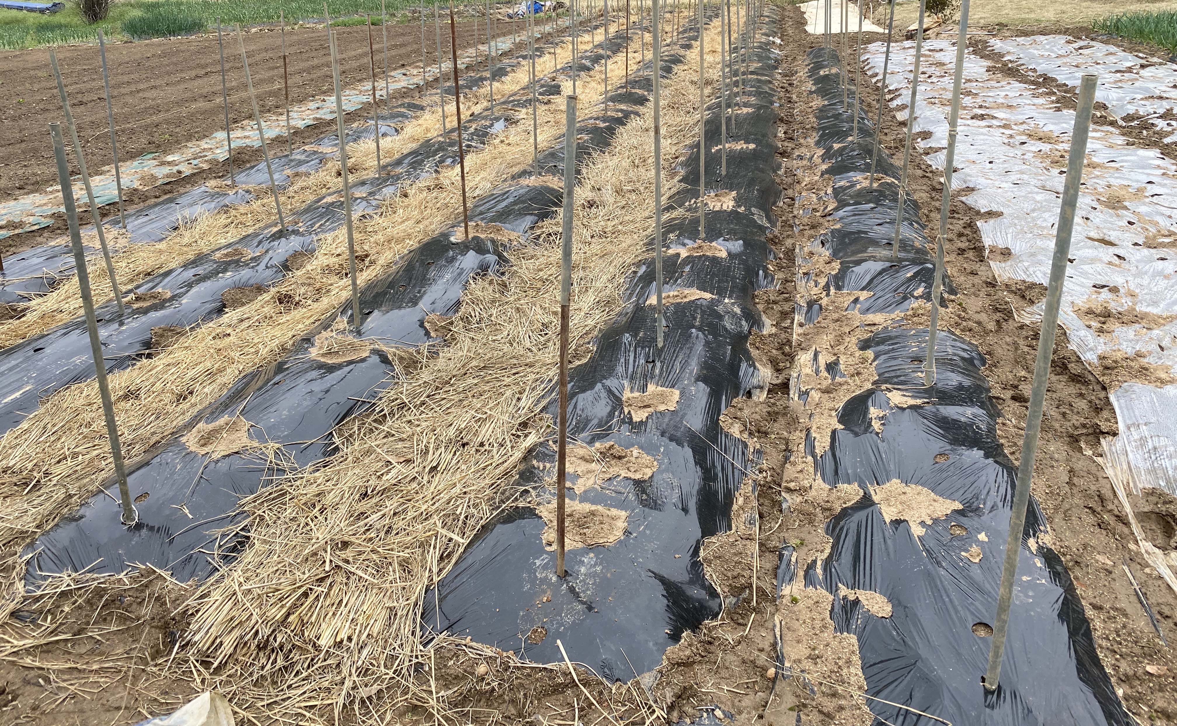 1. 농지를 잘 갈아주고, 흙을 푹푹 굴려서 공기순환을 도와주고, 뿌리가 편하게 자라 갈 수 있도록 토양을 푹 팽팽하게 만듭니다. 비닐을 씌워주고 그위에 고춧대를 세워줍니다.
