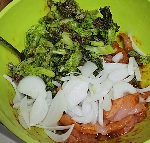 비가 너무 안내려서 뻐새진 상추를 손으로 쫙쫙~찢어서 그릇에 담고 굵은 소금을 살짝 뿌려서 숨을 죽여준다