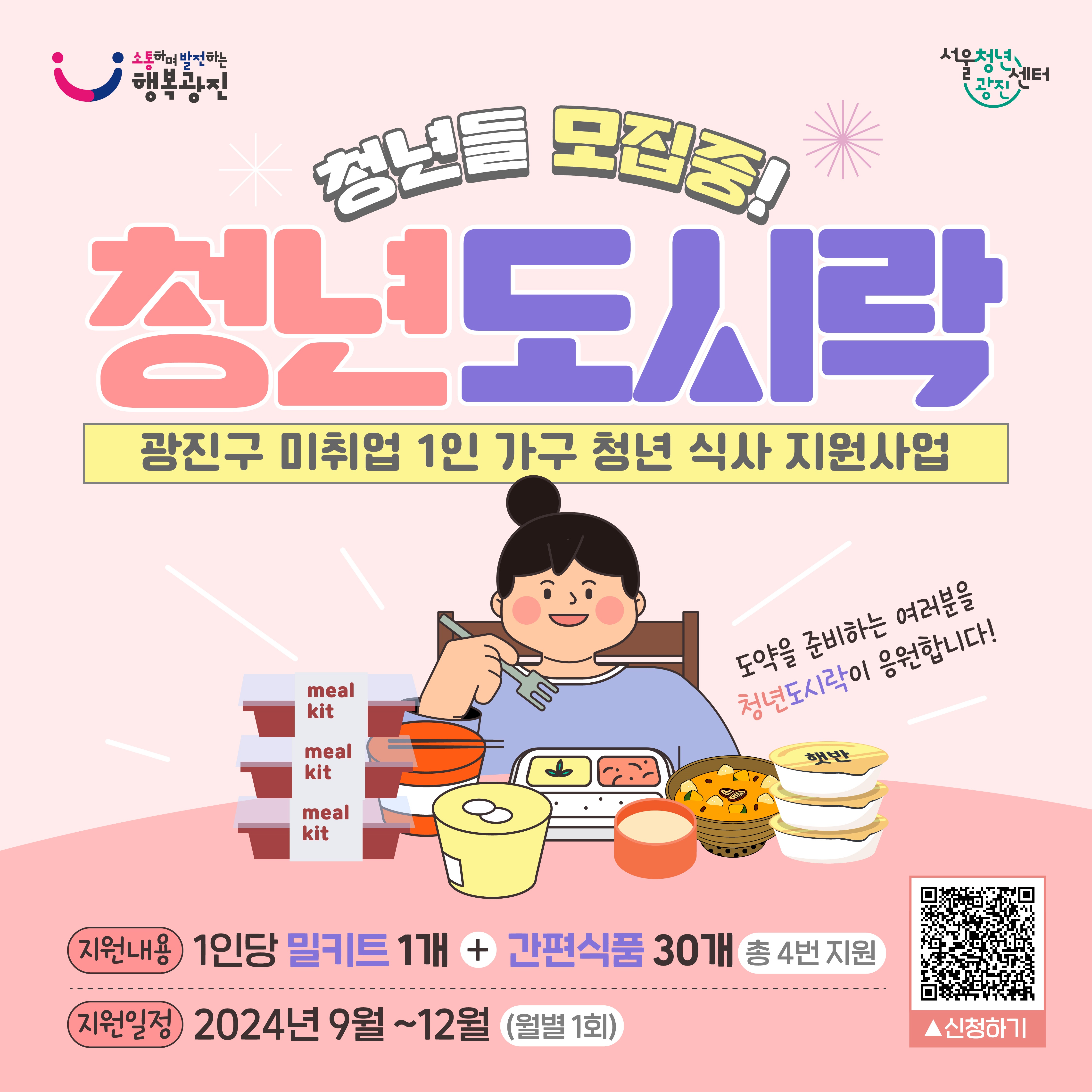 4. 배부방법 : 밀키트(서울청년센터 광진 직접 수령), 간편식품(자택 배송 또는 청년센터 직접 수령 택일)