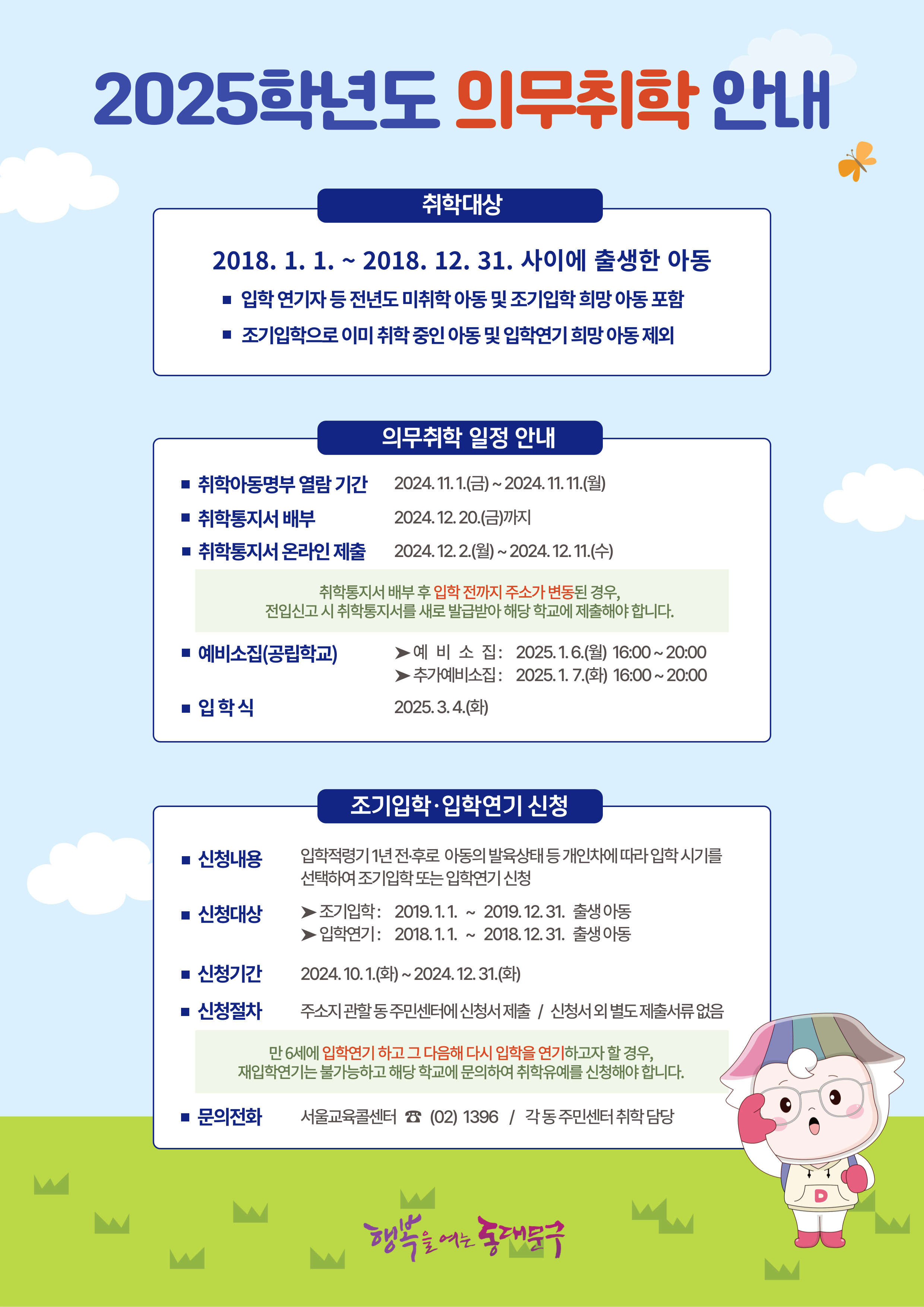 ❍ 문의전화: 서울교육콜센터 ☎ (02)1396 / 각 동 주민센터 취학담당
