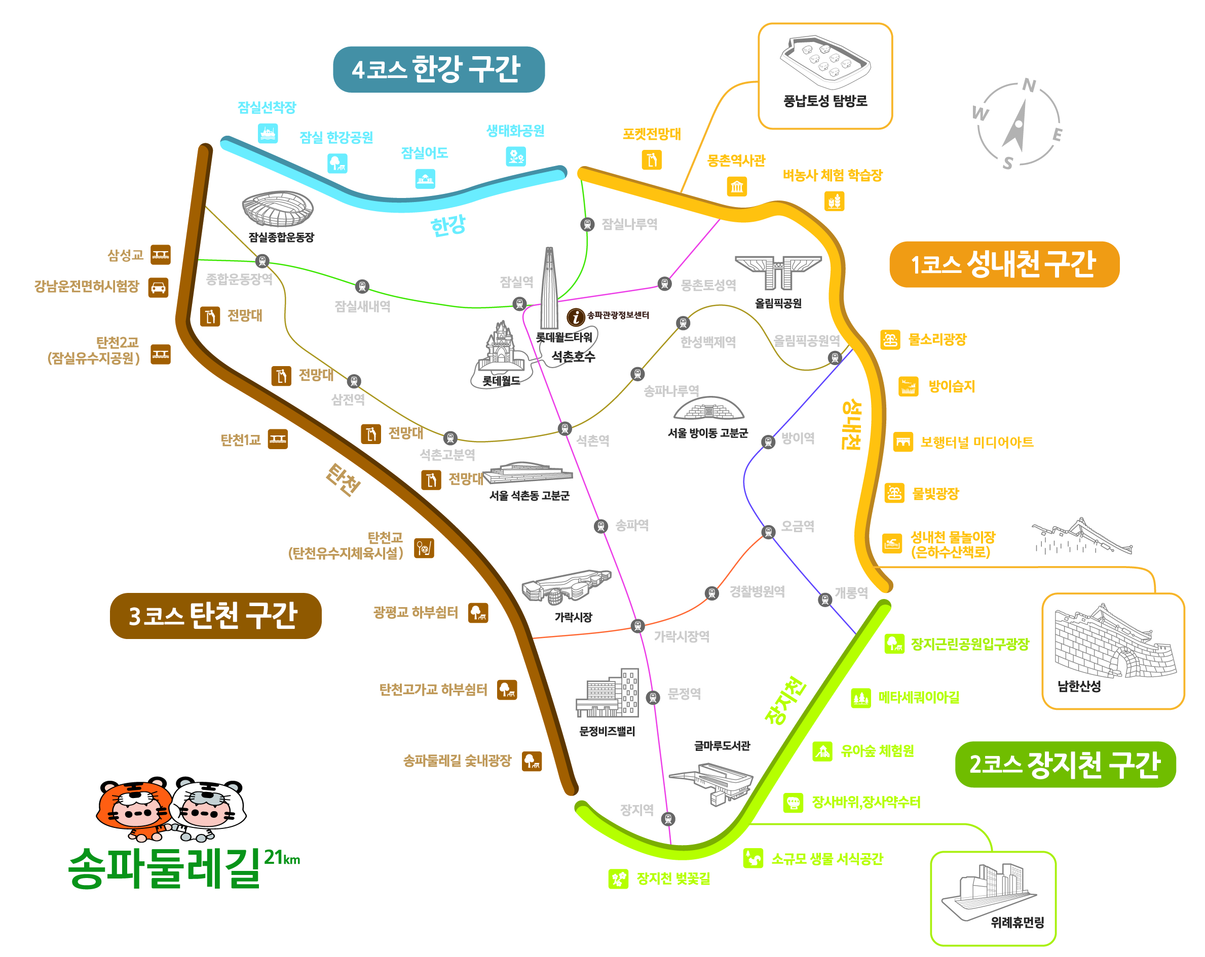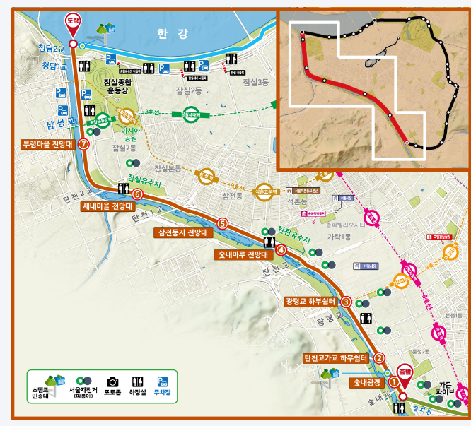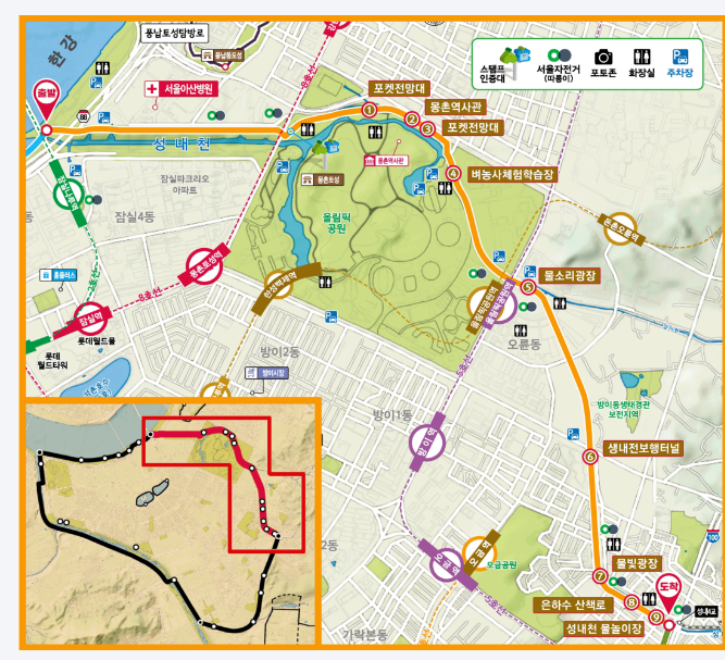물길과 숲길을 따라 네 구간을 완주하려면 5시간 30분 걸리는데, 올림픽공원·장지근린공원· 방이습지 등 자연 명소와 가든파이브·가락시장 등 송파구의 주요 상권까지 촘촘히 이어져 있어 사통팔달 송파 지역 어디서든 접근 가능하다.