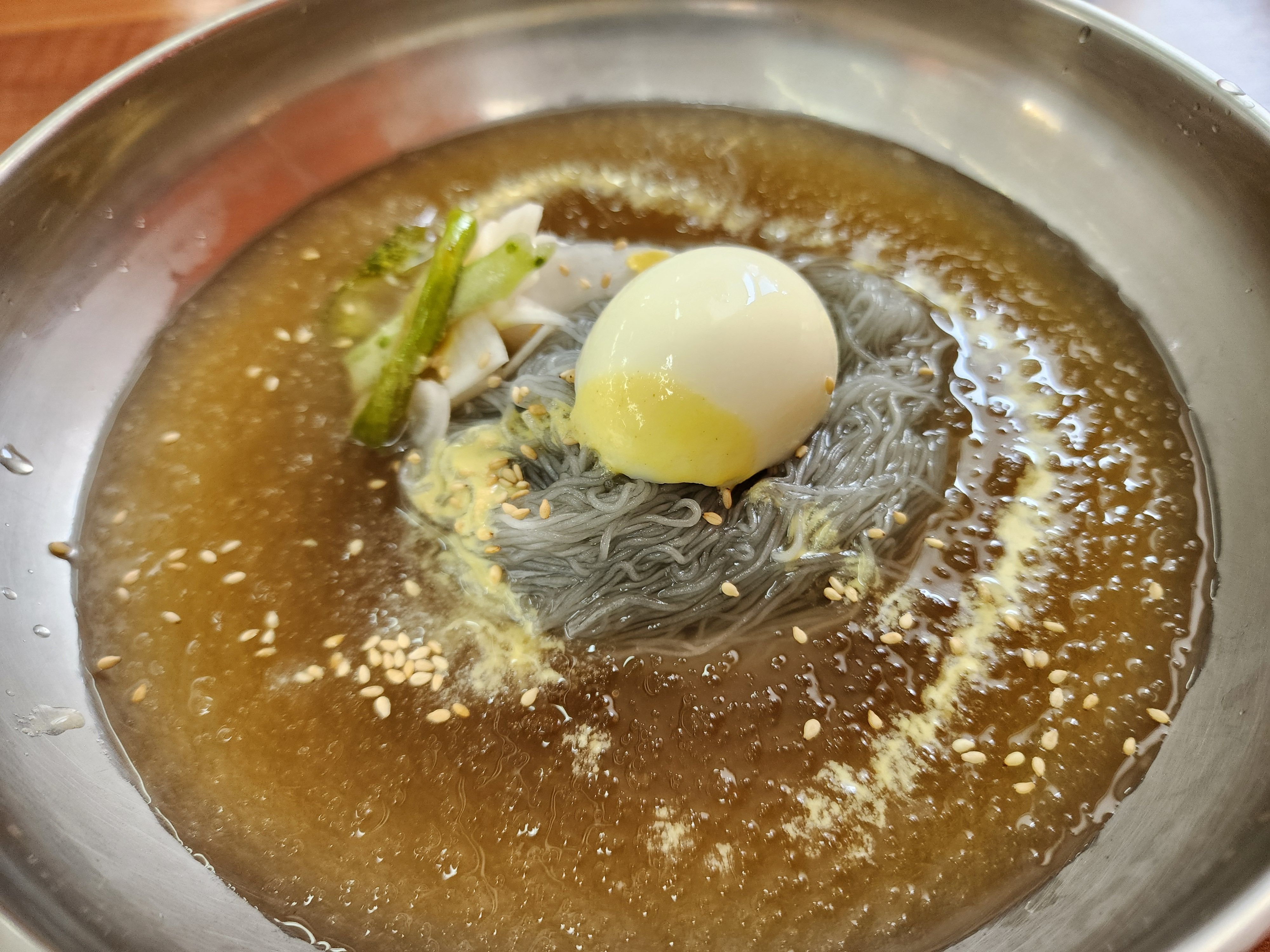 국물: 물냉면의 국물은 시원하고 담백한 맛을 내며, 주로 육수(소고기 육수, 닭 육수 등)와 함께 식초, 겨자 등을 추가하여 맛을 조절합니다. 국물의 맛과 깊이는 식당마다 다를 수 있습니다.