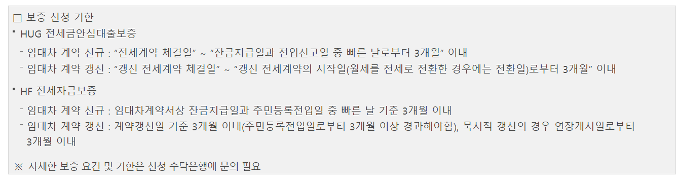 · 기금 전세자금 대출과 별도로 담보부 보증(HF, HUG 등)에 대해서도 보증 신청 기한 내 신청 완료해야 함