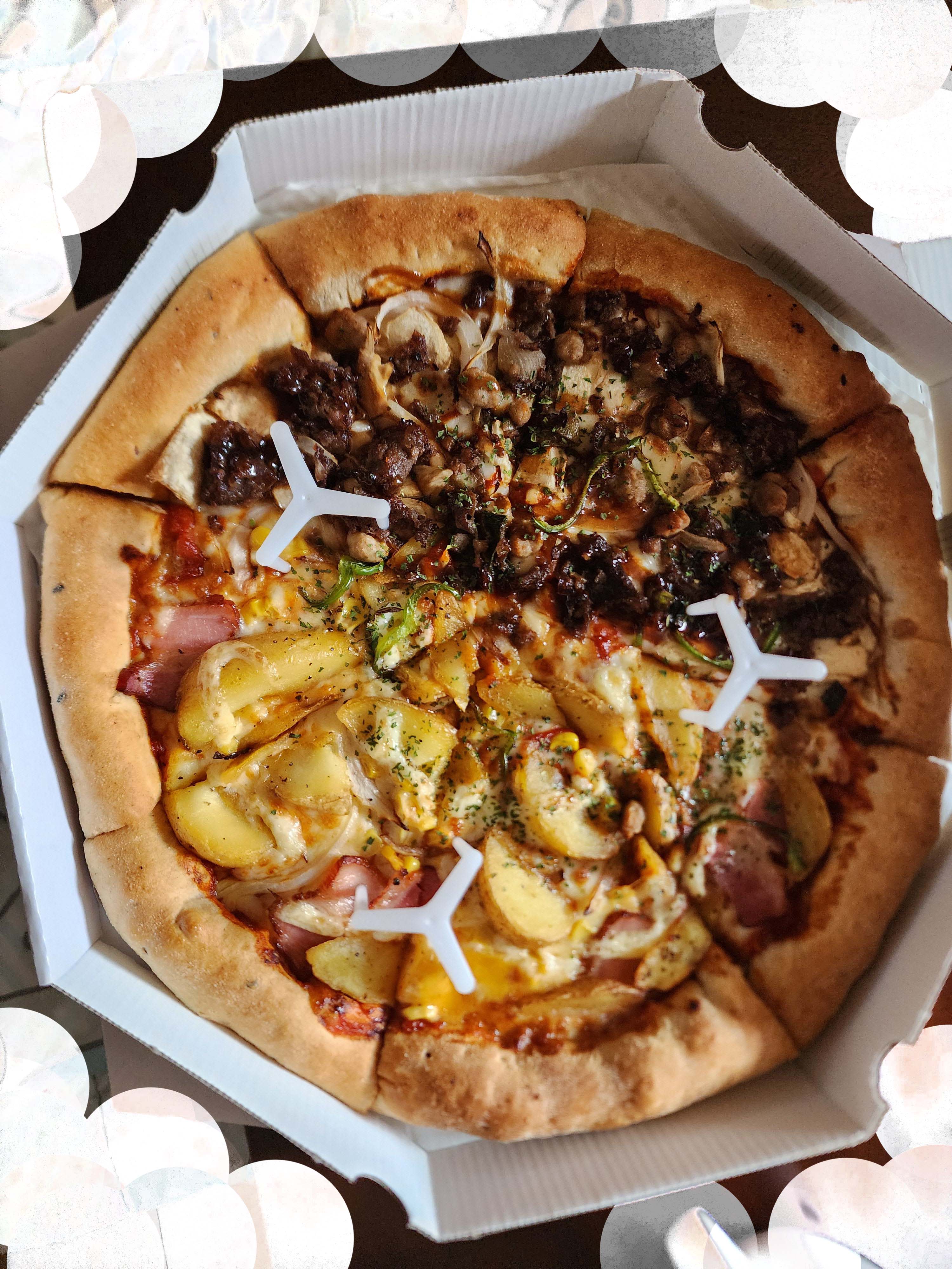 고구마를 좋아해서 고구마가 도우 끝 속에 숨어 있고 불고기와 포테이토 맞나 두 종류가 한판에 올라온 걸로 주문을 했습니다