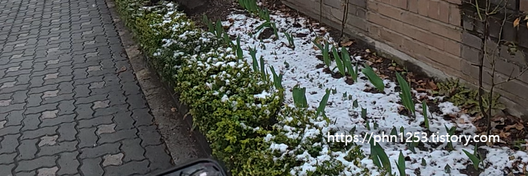 봄꽃이 피기 시작한 도로변 위로 눈이 쌓이는 모습은 마치 겨울이 "아직 나는 여기에 있다"고 마지막 인사를 하는 듯했습니다.
