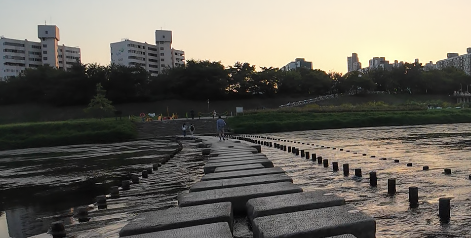 징검다리를 건너는 사람들의 발걸음은 저마다의 속도와 리듬을 가지고 있어, 그것만으로도 하나의 작은 풍경이 됩니다.