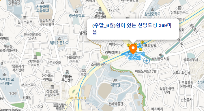 ㅇ운영코스 : 낙산초입(혜화문 맞은편) => 369사랑방 앞(369어머니 밥상 : 마을부녀회 운영) => 369마실 => 369예술터 => 각자성석 앞