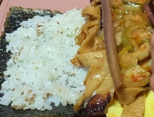 김을 준비하고 김밥 매트를 이용해 김 위에 밥을 고르게 펴줍니다.