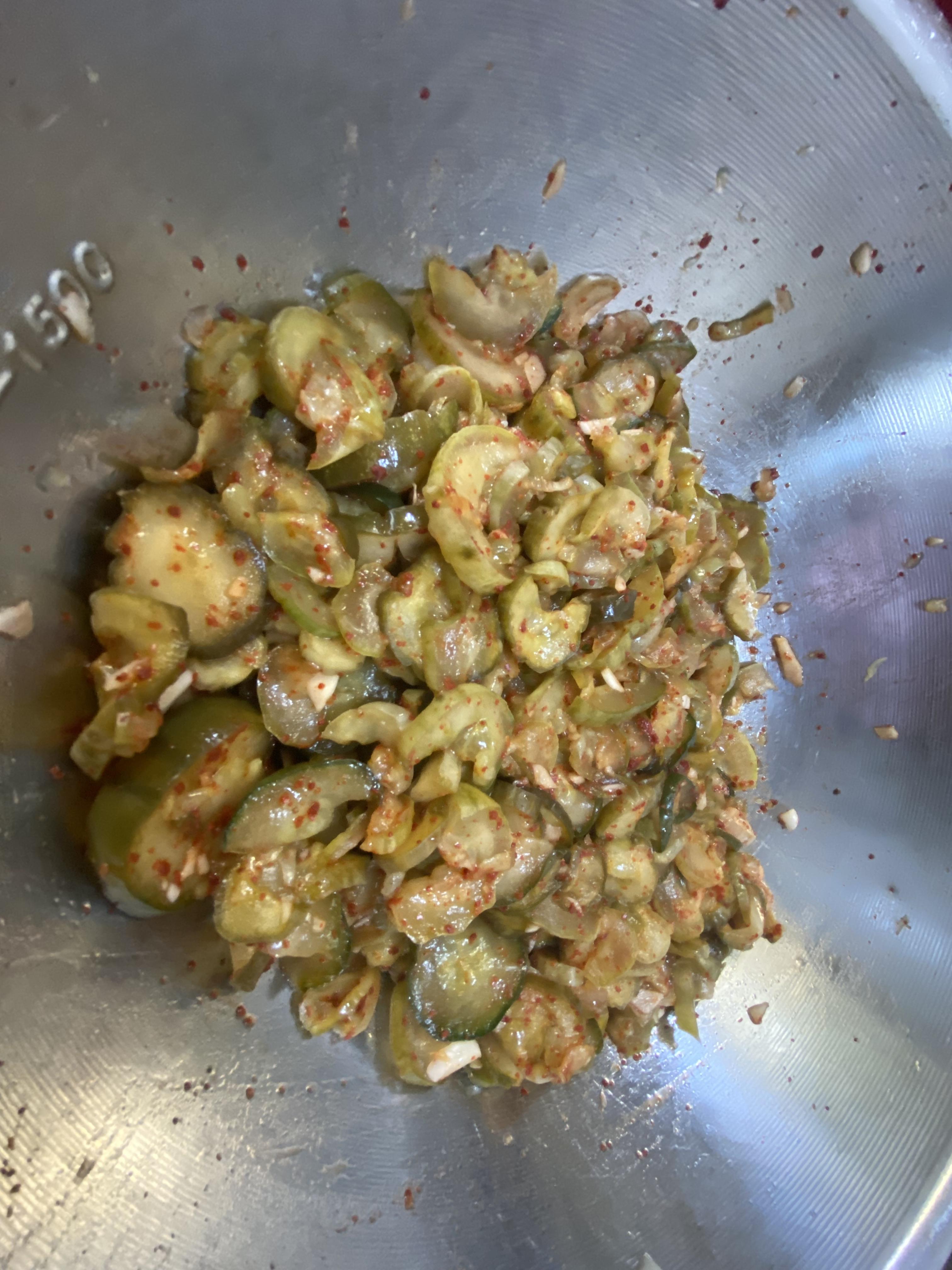 마지막으로 소금을 넣고 잘 저어줍니다. 소금은 오이의 수분을 조절하고 맛을 살리는 데 중요합니다.