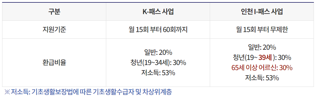 - 환급 비용 지급 기준: 월 대중교통 15회 이상 이용시 횟수 무제한 지급