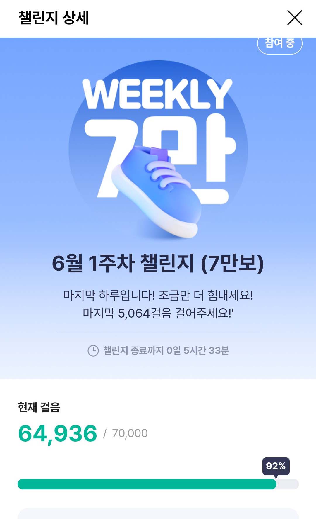 이미 충분히 걸었다고 생각했는데 5 천보를 더 걸어야 7만보를 완성합니다