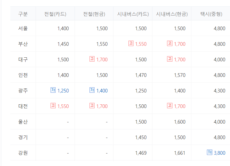 인터넷에 대중교통 요금을 지니 지역마다 기본금액이 나오네요
