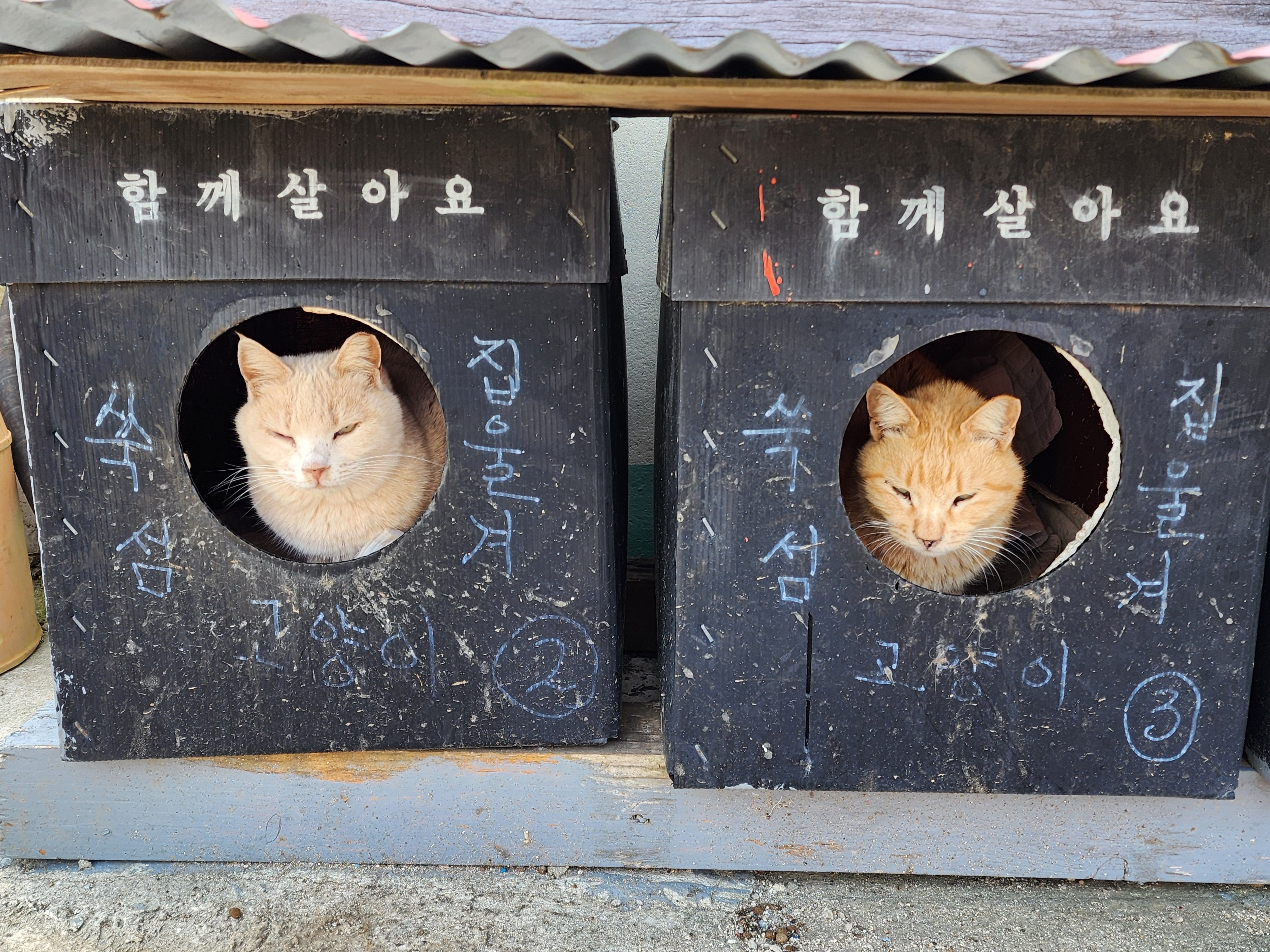 고양이들을 위해서 집이 만들어져 있고 놀이기구가 있는 환경을 보고 조금 놀랬습니다