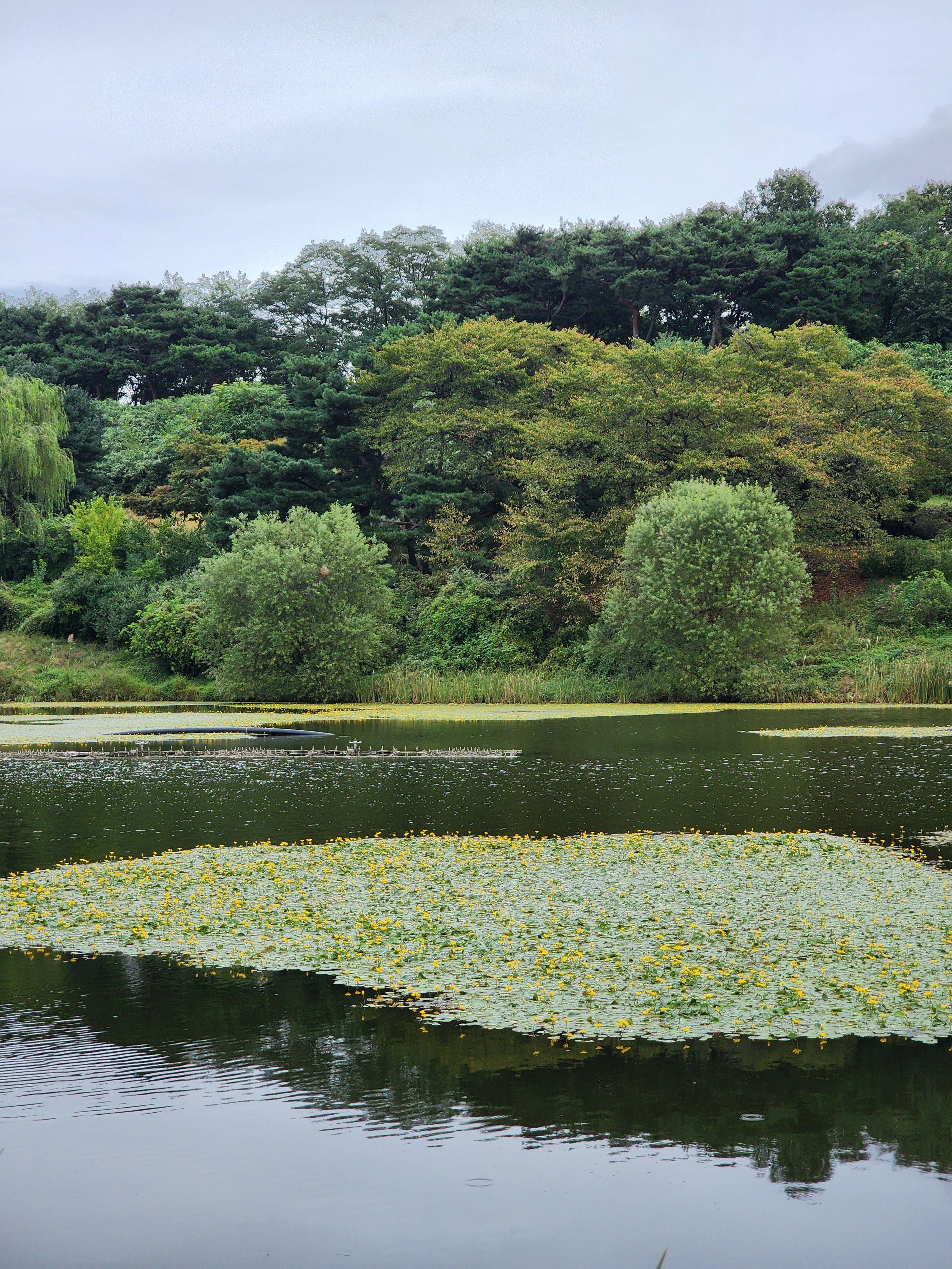연못?호수?위에 노란색 꽃이 보이는데 너무 예쁩니다
