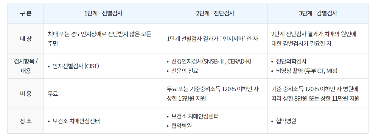 기존 중위소득 120% 초과인자 : 치매안심센터에서 진단검사(1, 2차) 무료시행, 협약병원에서 감별검사(3차) 지자체 예산(군비) 지원