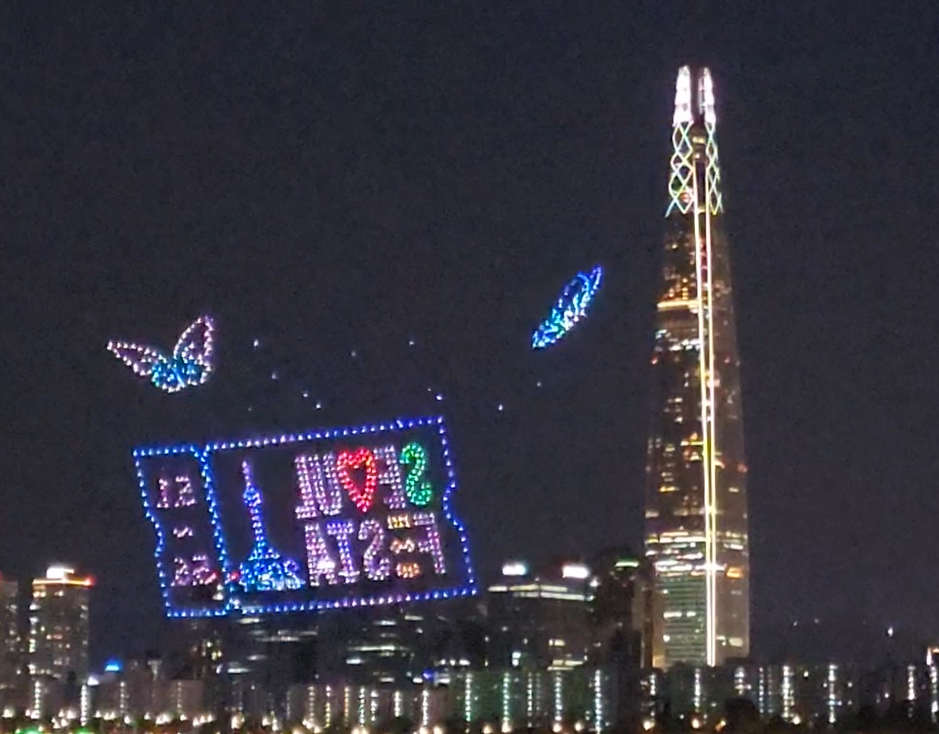 롯데타워옆으로 연출된 드론쇼가 굉장히 멋지게 느껴졌습니다