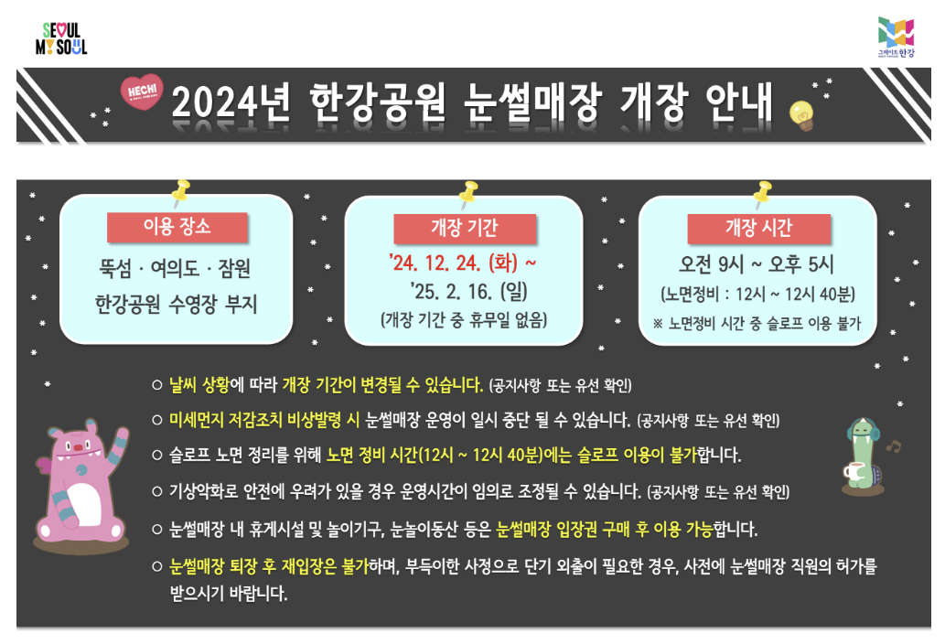 현재 기상 여건 상 한강공원 내 인공눈 생성에 어려움이 있어 한강공원 눈썰매장 개장일이 2024년 12월 24일(화)로 연기되었음을 알려드립니다.