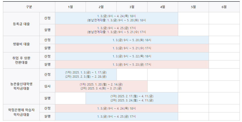 * 실행가능시간: 9시부터 17시까지(단, 등록금대출, 학점은행제 학습자 학자금대출은 대학(기관) 및 은행별 수납 마감기간/시간 내 실행 필수)