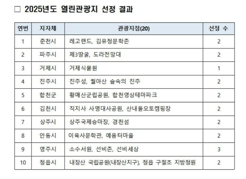 문화체육관광부는 한국관광공사와 함께 ‘2025년 열린관광지 조성 사업’ 대상지로 10개 지방자치단체의 관광지 20곳을 선정했다고 밝혔다.