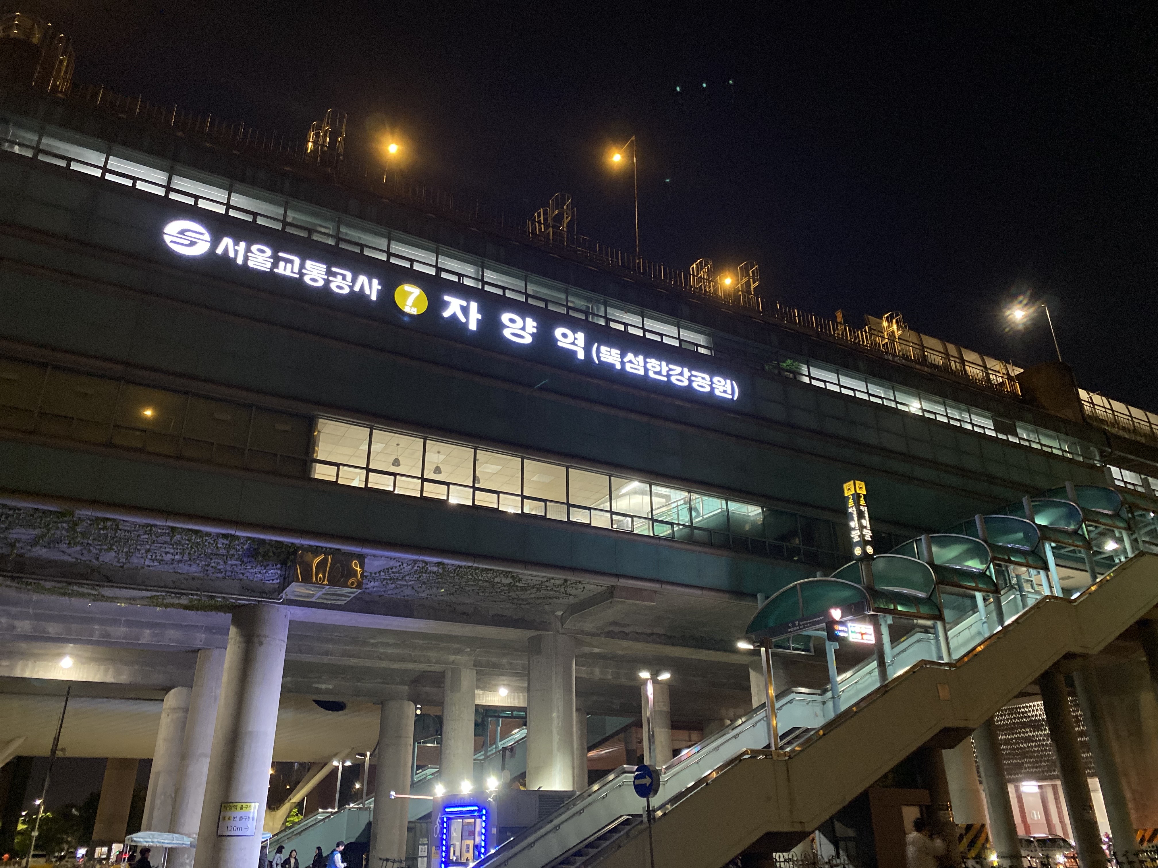 7호선 자양역 뚝섬한강공원 사람들이 꽤 많이 쉬어가는곳인거 같다