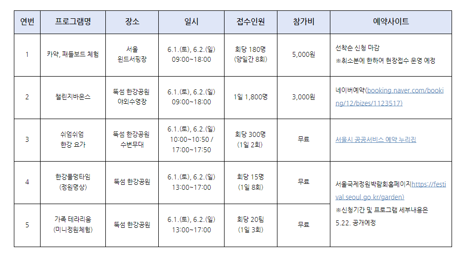 서울시 ‘제1회 쉬엄쉬엄 한강 3종 축제’에 참여할 참가자 신청 예약