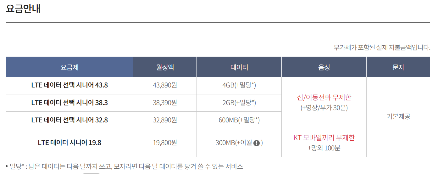 법적으로 만 65세 이상 시니어 고객 대상 더 넉넉한 데이터를 제공하는 요금제를 기록해봅니다