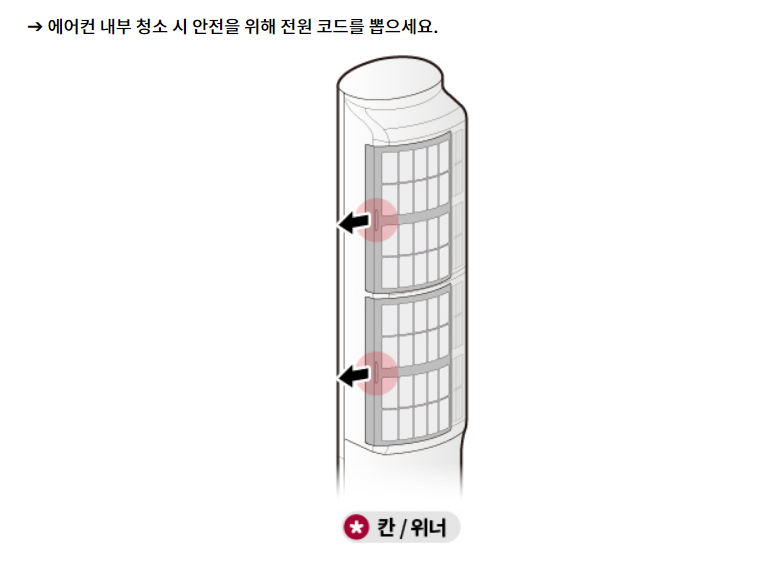 * 에어컨 내부 청소 시 안전을 위해 전원 코드를 뽑으세요